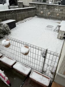 我が家の小庭もご覧の通りです。愛犬との庭での遊びも少しの間はおわずけです・・・